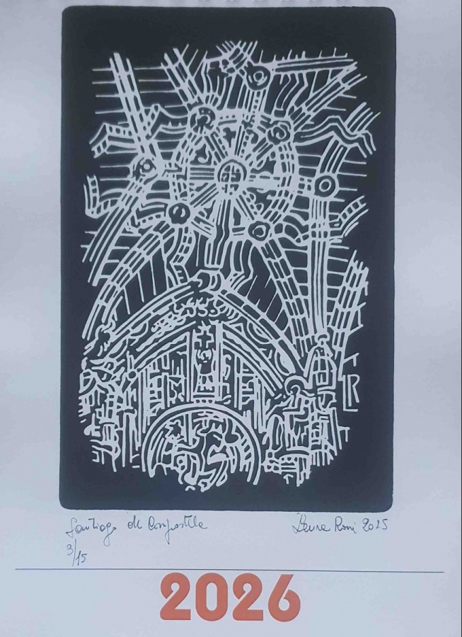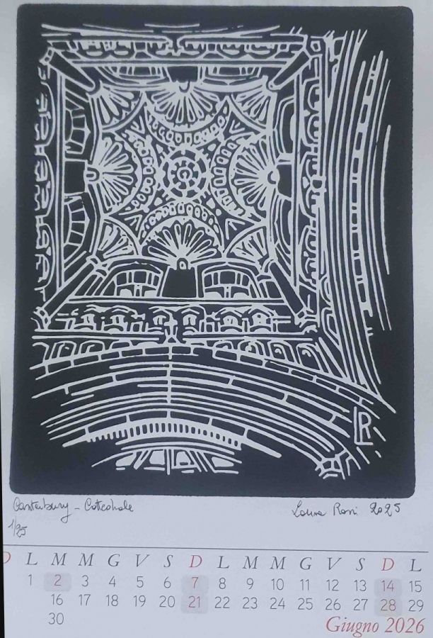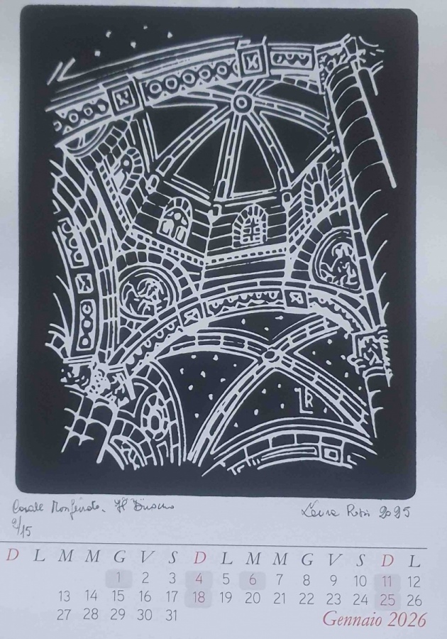 Laura Rossi nel suo nuovo calendario presenta i dodici mesi del 2026 illustrati con le incisioni stampate delle volte di: Santiago de Compostela 2015, Duomo di Casale Monferrato 2025 (Gennaio), Teatro Municipale di Casale Monferrato 2025 (Febbraio), Teatro Sociale di Valenza 2025 (Marzo), Santa Caterina in Casale Monferrato 2025 (Aprile), Sinagoga in Casale Monferrato 2025 (Maggio), Cattedrale di Cantenbury 2025 (Giugno), Abbazia di Bath 2025 (Luglio), S. Eusebio in Casale Monferrato 2025 (Agosto), S. Michele in Casale Monferrato 2025 (Settembre), Beata Vergine Addolorata in Vignale Monferrato 2025 (Ottobre), Galleria Subalpina di Torino 2025 (Novembre), S. Spiridione in Corfù 2025 (Dicembre).